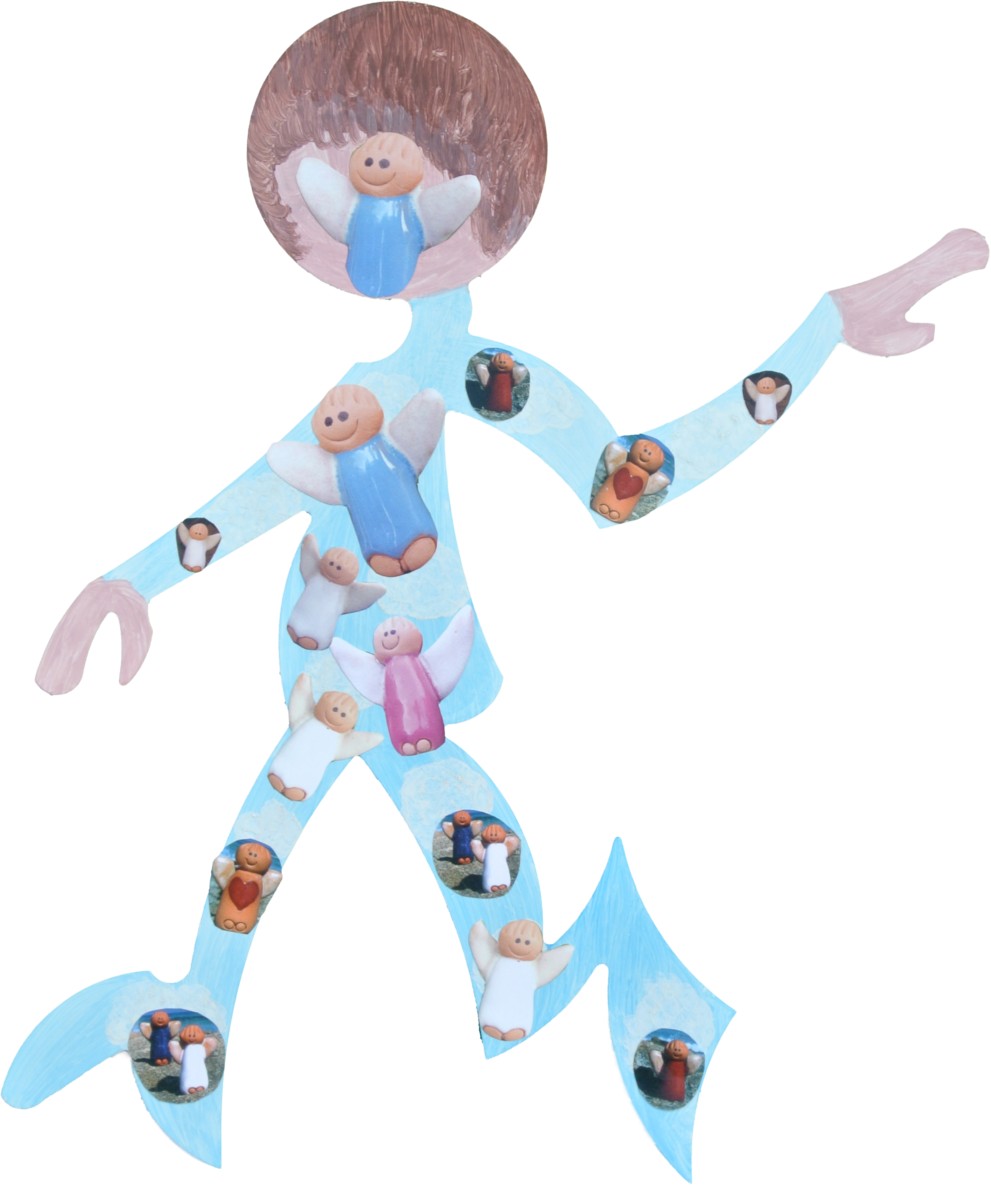 Dieser Mensch soll als Schutzengel für alle Menschen dienen. Die kleinen Engel sind im Original von mir handgefertigt aus Ton. Ich verkaufe sie als Glücksbringer und als Postkarten. Jeder Engel ist ein Unikat. Über dem Menschen könnte das Motto stehen: „Engel trifft man überall“ oder „Zeit für Engelmenschen“