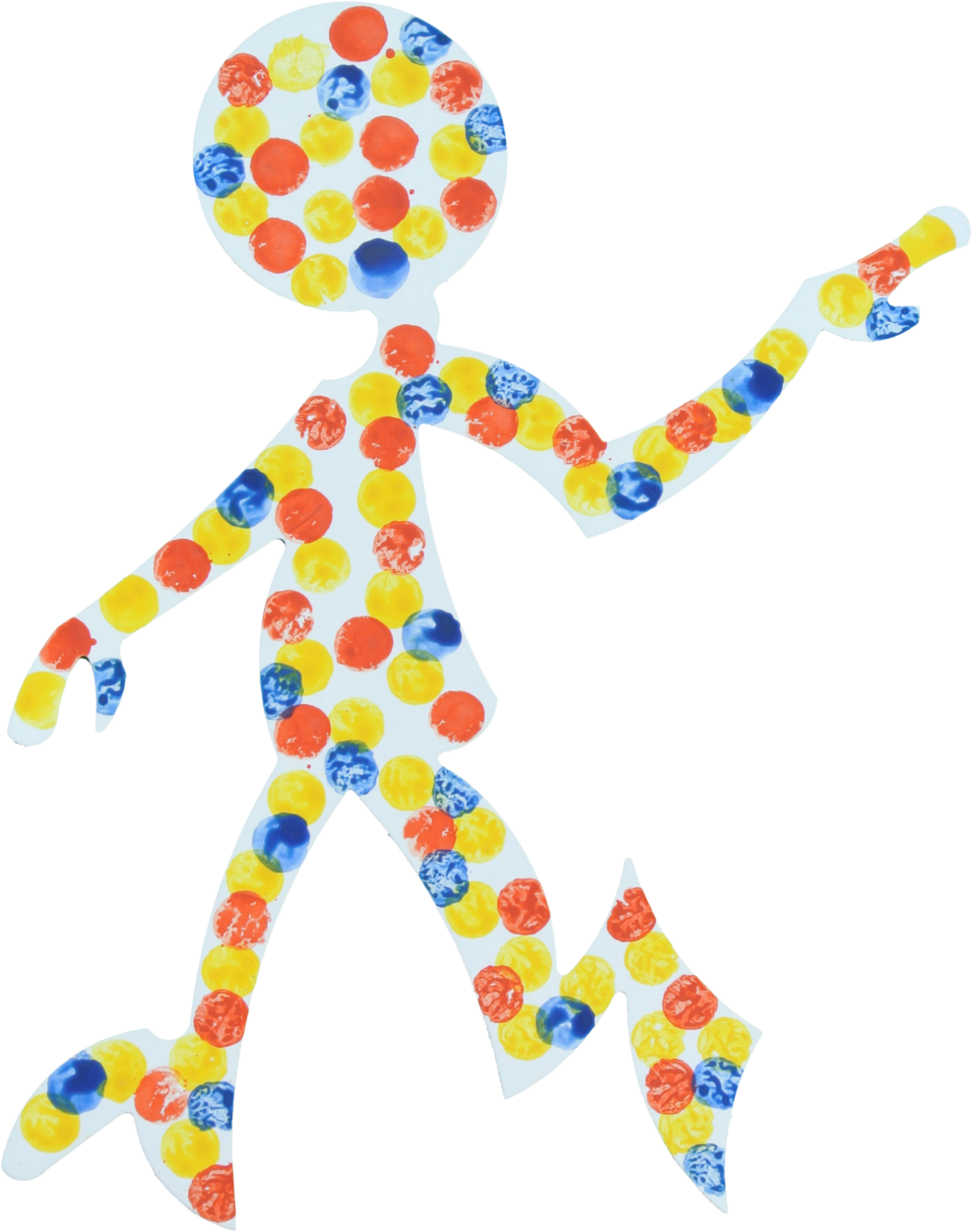 Ich wollte diesen Mensch mit „Drucktechnik“ gestalten – ich nahm einen Korken einer Weinflasche und bedruckte den Menschen erst mit Gelb, dann mit Rot und zum Schluss mit Blau.