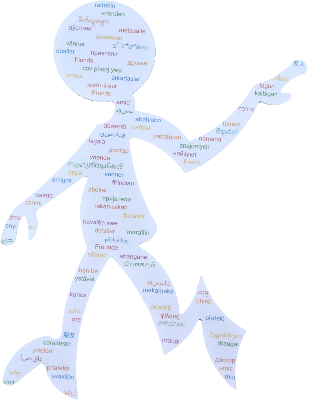 Bei der Gestaltung von „Freunde“ wollte ich das Thema Kommunikation, das ja die Ursprungs-Idee der Bunten Menschen ist, aufgreifen und weiterdenken. Dazu entschied ich mich eine konkrete Information zu verwenden: das Wort „Freunde“. Ich habe „Freunde“ in 98 Sprachen übersetzt (durch Doppelungen nur 89 Schreibvarianten) und auf den bunten Menschen geschrieben. Die Information „Freunde“ soll als Vorbild für das Zusammenleben der Menschen dienen. Zum einen kann jeder diese Information in seiner Sprache lesen und verstehen, wodurch sich sicher keiner ausgeschlossen, sondern angesprochen, fühlt. Zum anderen soll die Gestaltung zeigen, dass sämtliche Sprachen der Welt zusammen auf einen Bunten Menschen auskommen. Sie harmonieren zusammen, ergänzen sich und keine Sprache dominiert eine andere. Genauso sollten die Menschen miteinander harmonieren und sich in ihrer Vielfalt ergänzen.
