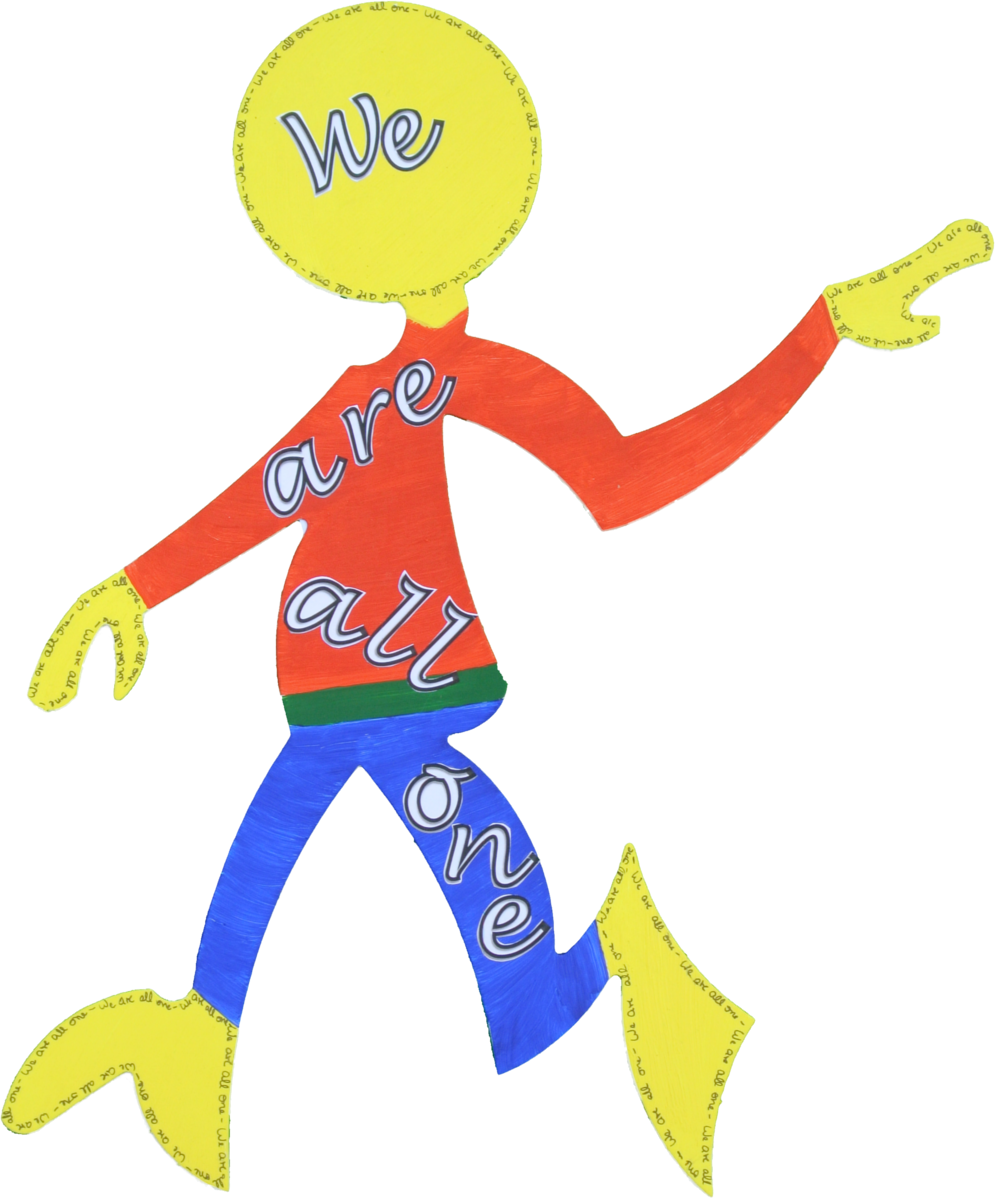 Globe = Globus: Diese Figur trägt die 4 Farben der bunten Menschen. Der Satz „We are all one“ wurde vor 3 Wochen von einem Flüchtling aus Ghana gesagt. Er meinte damit, dass es egal ist aus welchem Land man kommt.